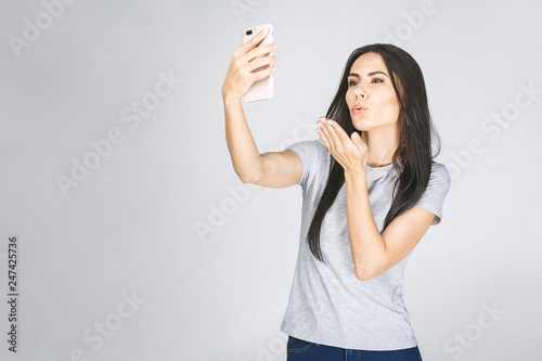 Studio portrait of beautiful woman smiling with white teeth and making selfie, photographing herself over white background.