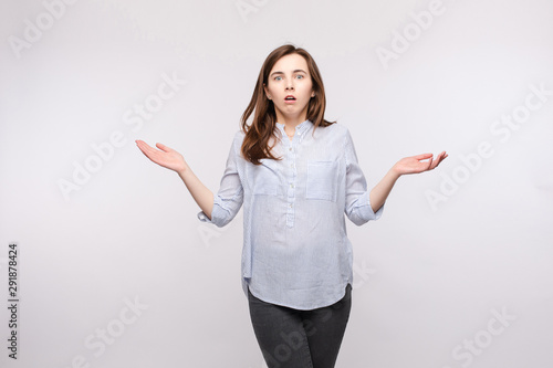 Studio portrait of brunette woman in casual clothes showing puzzlement or confusion and reacting with her arms up in amazement.