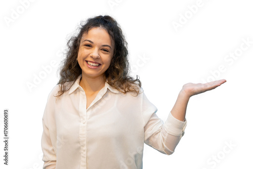 Studio portrait of cheerful businesswoman showing open hand palm, isolated on transparent background