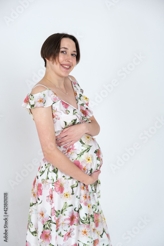 Studio portrait of cheerful young pregnant woman in summer dress on white gray background, happy pregnancy concept