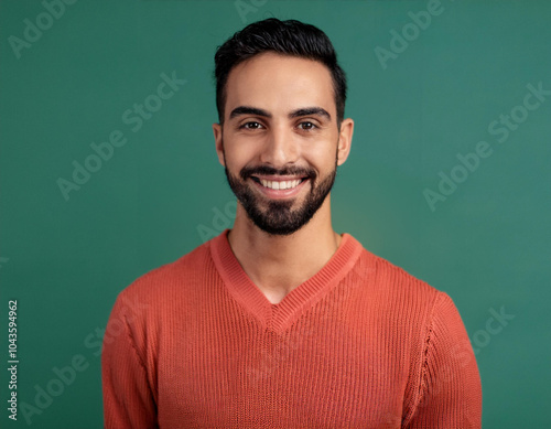 Studio Portrait of Handsome Young Man Happily Smiling Against Green Background