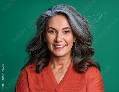 Studio Portrait of Mature Teacher Woman Happily Smiling Against Colored Studio Background