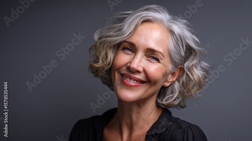 studio portrait of stylish middle age smiling 50 - 55 year old woman posing on grey background