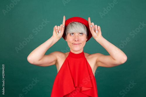 Studio portrait of stylish woman in red dress on green background funny crazy does cow gesture