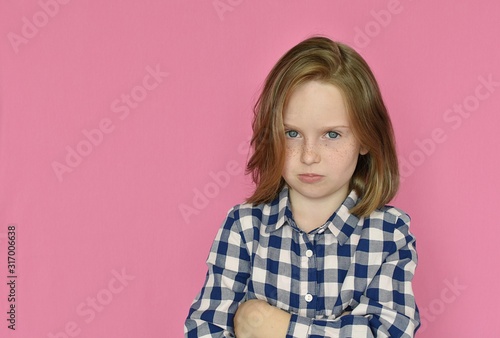 Studio portrait of unhappy, angry, not satisfied, stubborn girl on pink background.