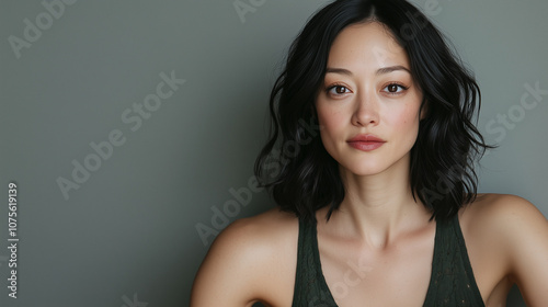 studio portrait of woman with shoulder-length wavy black hair
