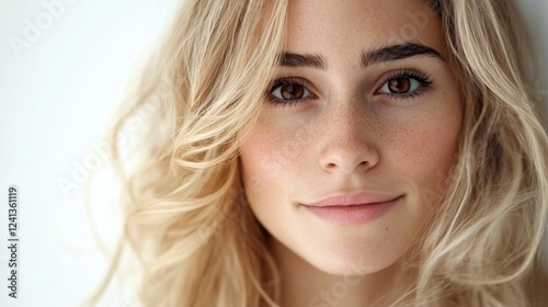 Studio portrait of young adult woman with wavy blonde hair and brown eyes wearing natural makeup against white backdrop capturing soft beauty and elegance