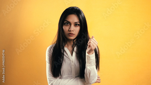Studio portrait of young Asian businesswoman gesturing with hand on yellow background