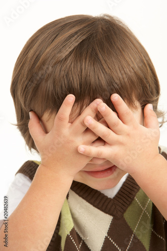 Studio Portrait Of Young Boy Covering Eyes
