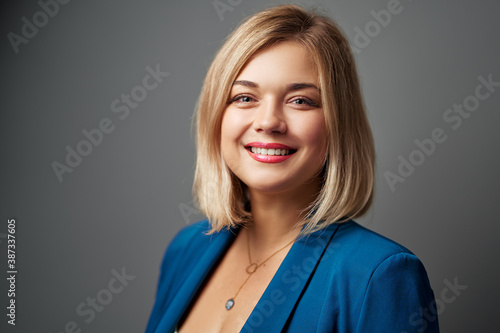 Studio portrait of young business woman looking at camera against grey wall.