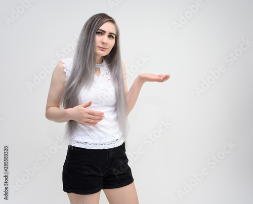 Studio portrait on the waist of a pretty manager girl with long beautiful hair in a white T-shirt and black shorts on a white background. He stands straight, smiles, shows with his hands.