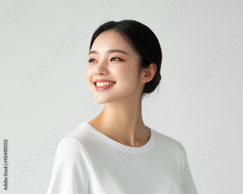 Studio shot of a beautiful Asian idol girl with a happy expression. Natural makeup on beautiful model with wide smile healthy skin side view copy space.