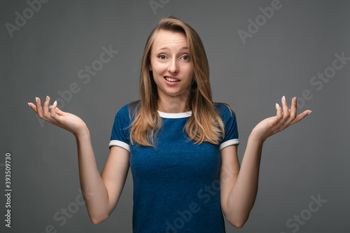 Studio shot of a young woman shrugging shoulders looking at the camera being at loss. Concept of doubt and uncertainty