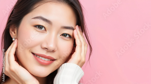 Studio shot of Beautiful young Asian woman with clean fresh skin on pink pastel background, Face care, Facial treatment, beauty and spa