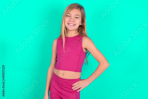 Studio shot of cheerful blonde little kid girl wearing pink sport clothes over green background keeps hand on hip, smiles broadly.