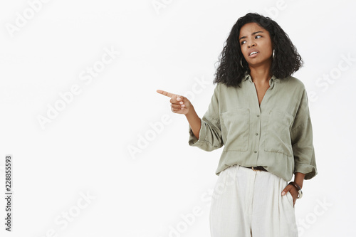 Studio shot of displeased gloomy dark-skinned female feeling jealous and envy pointing with regret and sadness left smirking displeased standing bothered over white background
