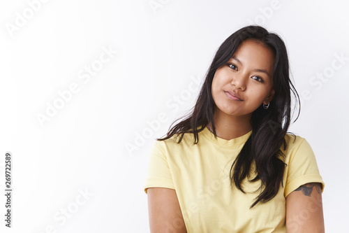 Studio shot of dreamy gentle young attractive asian female in yellow t-shirt tiltintg head tender and gazing at camera, grinning happily and lovely with romantic look over white wall.