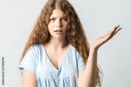 Studio shot of frustrated female with curly long hairstyle gesturing with raised palm