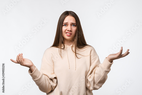 Studio shot of Insecure puzzled young female, spreads hands with doubt. Concept of doubt, uncertainty and confusion