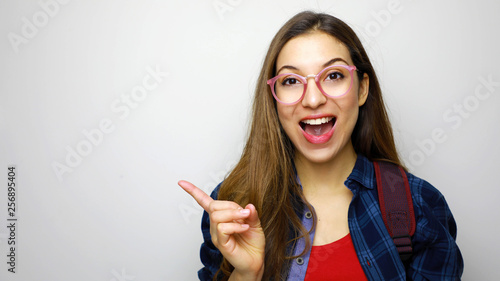 Studio shot of positive student girl on white background wearing glasses and backpack, pointing finger looking excited