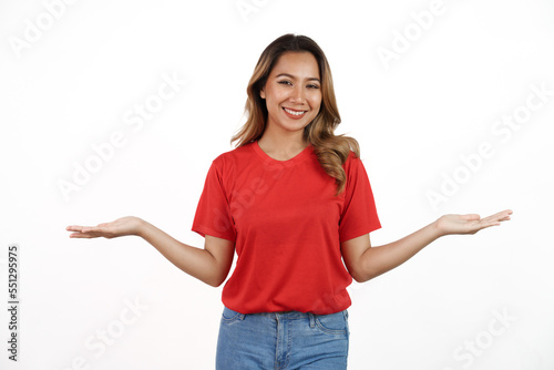 Studio shot of pretty Asian woman with red t-shirt isolated on white background. Palm up or holding product