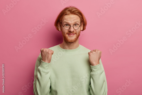 Studio shot of relieved ginger Caucasian man clenches fists, anticipates for something good happened, wears round spectacles and jumper, isolated over pink pastel wall. Body language concept