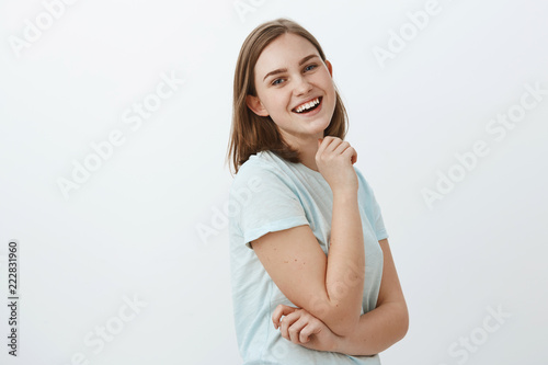 Studio shot of skillful creative and ambitious european woman in trendy t-shirt standing in profile over white wall turning at camera with satisfied happy and self-assured smile holding hand on chin