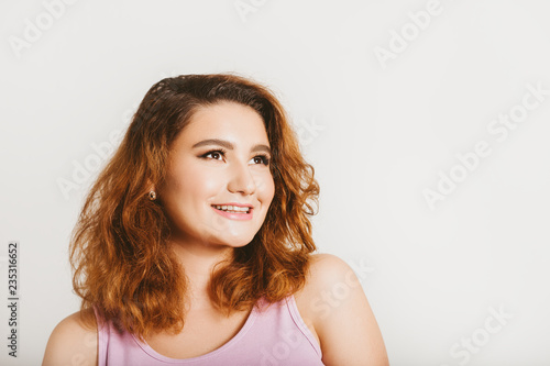 Studio shot of young 20-25 year old woman, bright red hair, pink lipstick