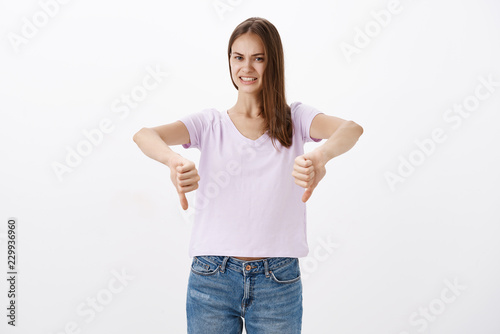 Studio shto of displeased dissatisfied attractive young female customer in blouse and jeans showing thumbs down smiling awkwardly while giving negative feedback and rejection bad idea over white wall