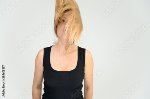 Studio waist-length photo portrait of a pretty beautiful young happy blonde woman on a white background in a black t-shirt. Smiling, talking, showing emotions.