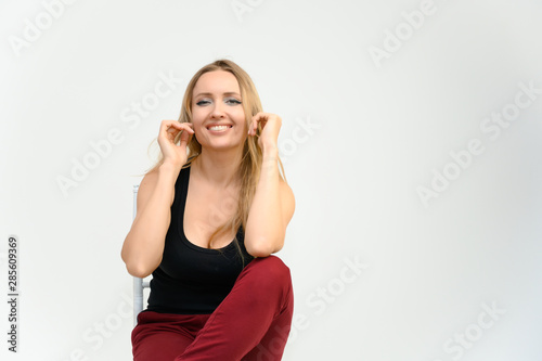 Studio waist-length photo portrait of a pretty beautiful young happy blonde woman with long hair on a white background in a black t-shirt and red trousers. Sits on a chair, smiles, shows emotions.