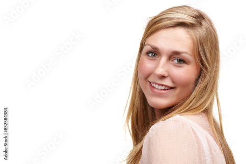 Studio, woman and happy in portrait for beauty on white background, natural or organic treatment. Face, female person and smile or satisfied in skincare routine for wellness, self care and confident
