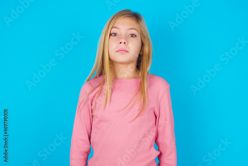 Stunned caucasian little kid girl wearing long sleeve shirt over blue background stares reacts on shocking news. Astonished blonde kid holds breath