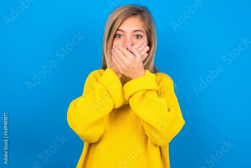 Stunned caucasian teen girl wearing yellow sweater over blue studio background covers mouth with both hands being afraid from something or after hearing stunning gossips.