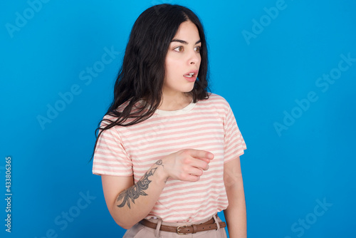 Stunned young beautiful tattooed girl wearing pink striped t-shirt standing against blue background with greatly surprised expression points away on copy space, indicates something