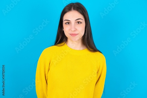 Stunned young brunette girl wearing yellow knitted sweater against blue wall stares reacts on shocking news. Astonished girl holds breath