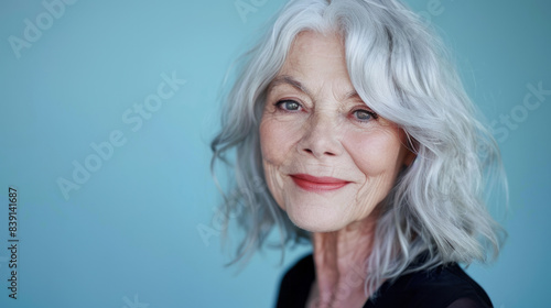 stunning beautiful and self confident best aged woman with grey hair smiling into camera on light blue background