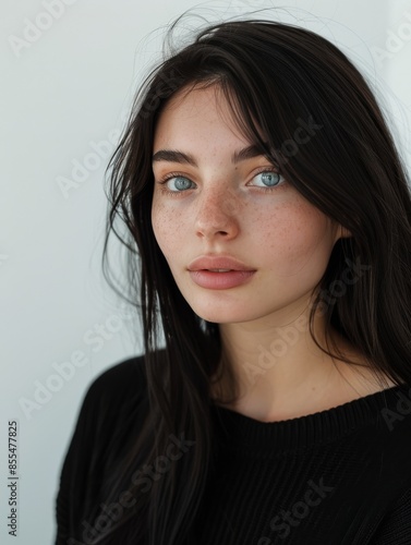 Stunning Portrait of a Young Woman: 20-Year-Old Model with Shiny Long Black Hair and Blue Eyes