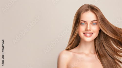Stunning woman with flawless skin and lustrous hair against a soft grey backdrop, radiating natural beauty.