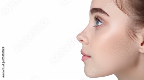 Stunning young woman poses gracefully against a white backdrop, showcasing natural beauty and confidence.