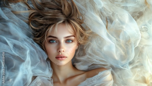 stunningly beautiful woman in a gorgeous chiffon silver dress with glitter. magnificent close up portrait beautiful woman in luxurious fabrics. copy space