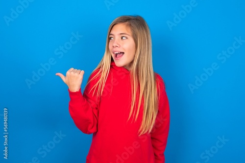 Stupefied caucasian teen girl wearing red sweater over blue studio wall with surprised expression, opens eyes and mouth widely, points aside with thumb, shows something strange. Advertisement concept.