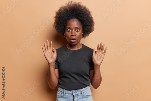 Stupefied insecure dark skinned woman with bushy hair keeps palms raised tries to prevent herself from something scarying dressed in casual black t shirt and jeans isolated over beige background