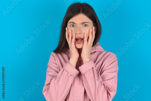 Stupefied young beautiful Caucasian woman wearing pink raincoat over blue wall expresses excitement and thrill, keeps jaw dropped, hands on cheeks, has eyes popped out