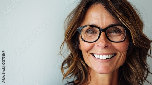 stylish businesswoman in her middle years with spectacles on a gray background.