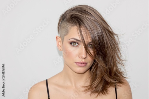 Stylish Female with Trendy Brown Sidecut Hairstyle Portrait