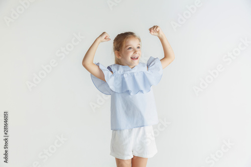 Stylish little smiling girl posing in casual clothes isolated on white studio background. Caucasian blonde female model. Human emotions, facial expression, childhood. Winning, celebrating, smiling.