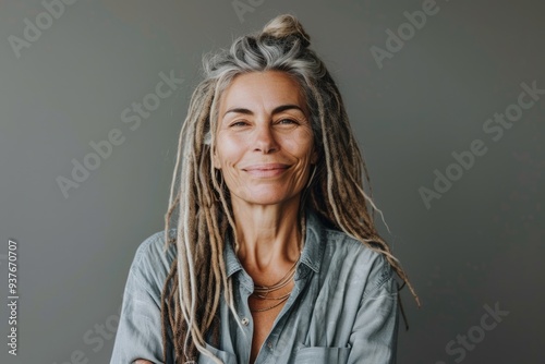Stylish mature woman with dreadlocks smiling in studio portrait.