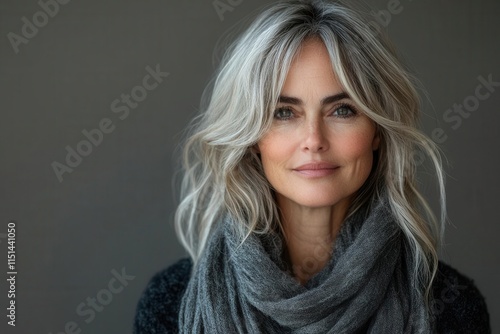 stylish portrait of a middle-aged woman in her 50s, exuding confidence and warmth, set against a smooth grey background that highlights her fashionable attire and engaging smile