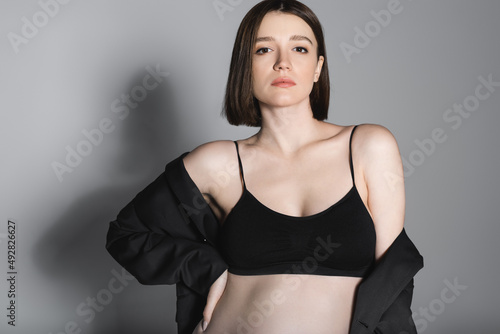 Stylish pregnant woman in top and jacket looking at camera on grey background